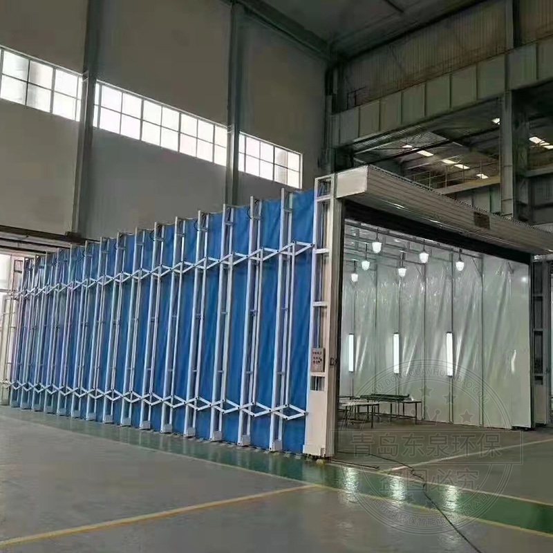 伸縮移動噴漆前室和沖擊式無泵水幕過濾器結合使用,是解決重型工件噴漆時移動難的問題,工作時將伸縮移動噴漆前室收縮,用天車將重型工件吊運到噴漆場地,再將活動前室展開,罩住工件,即可工作。噴漆后再將前室收縮,用天車將工件吊離,不影響天車的工作。